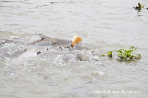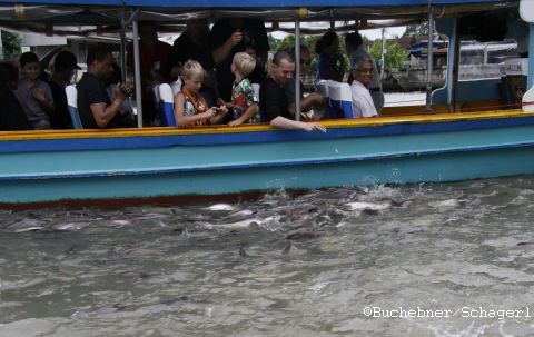 Waehrend der Fahrt hat unser Boot einmal angehalten, um uns die dort angesiedelten Fische fuettern zu lassen. Die leben dort in Scharen, weil in Tempelnaehe nicht gefischt wird („people believe if you fish near temple – it’s caraccident“).