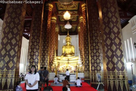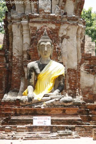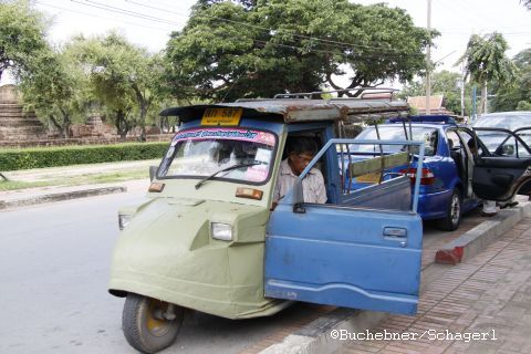 Am 6. August, frueh morgens, halb zehn – wie in der Knoppers Werbung – haben wir uns ein Tuk Tuk, das in Ayutthaya etwas anders als in Bangkok aussieht, gerufen und liessen uns davon den ganzen Tag von Tempel zu Tempel karren. Der Fahrer wartete waehrend der Watbesichtigungen immer im Tuk Tuk und plante bereits die weiteren Stopps.