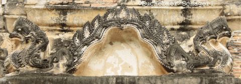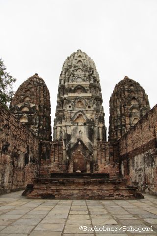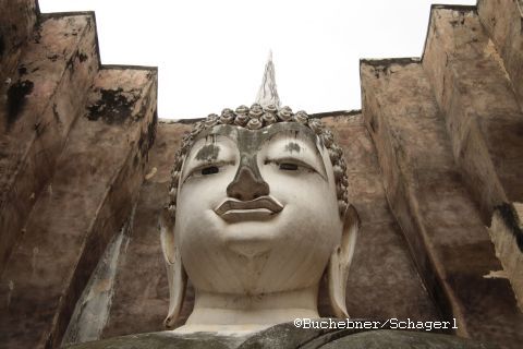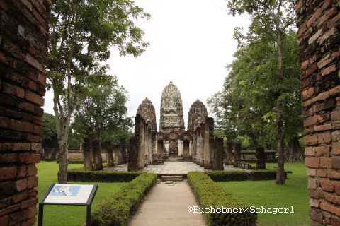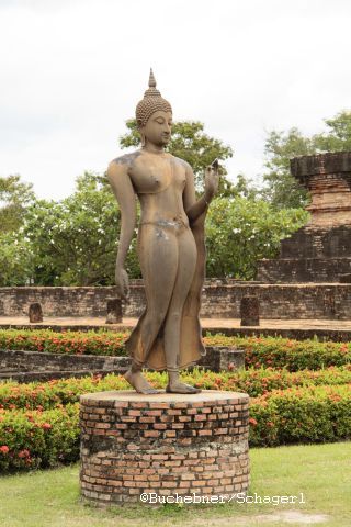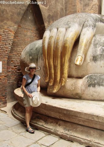 Leider hat Sukhothai, das als historische Wiege und das goldene Zeitalter Thailands gilt, unsere Erwartungen nicht ganz erfuellt. Man liest, es waere nochmal um eine Stufe interessanter als Ayutthaya, was die historischen Bauwerke betrifft. Diesem Urteil koennen wir uns leider nicht anschliessen. Vor die Wahl gestellt, wuerden wir Ayutthaya klar den Vorzug geben. Dennoch haben uns die folgenden zwei Wats besonders gut gefallen: