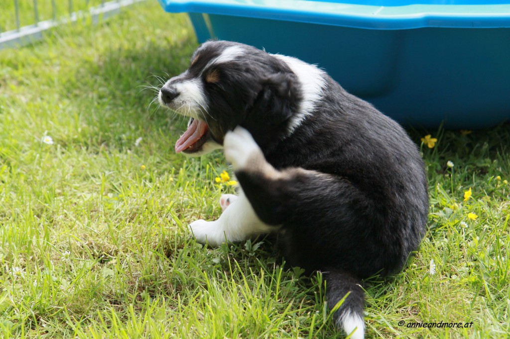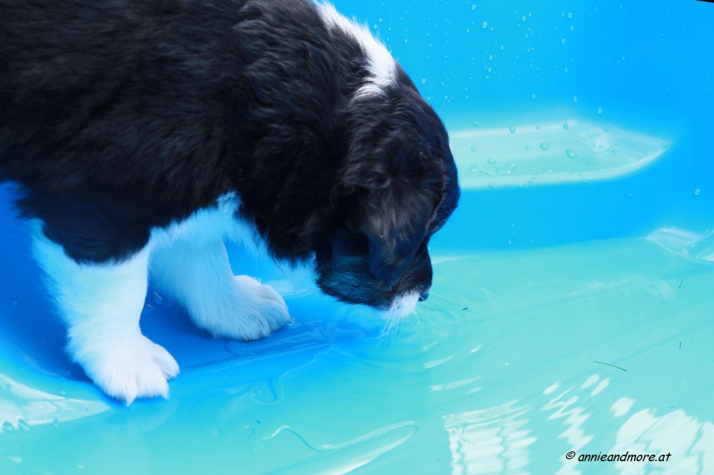 „Dip“ ist eindeutig die größte Wasserratte unter Hollys Welpen. Das ist wohl auch der Grund, warum die meisten und besten Fotos dieses süßen Burschen am „Pool“ entstanden sind!